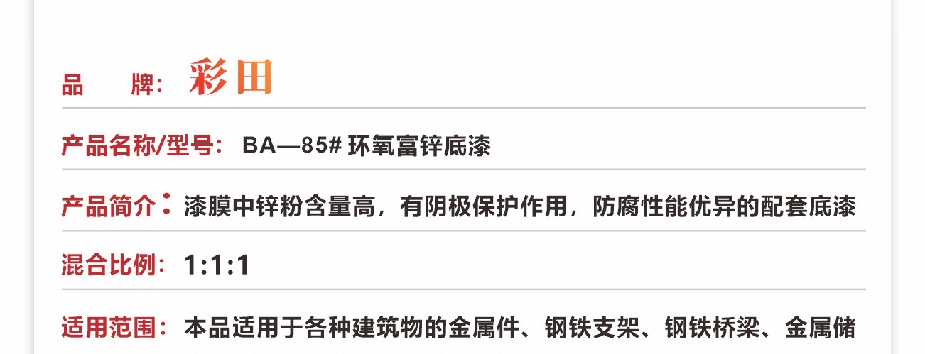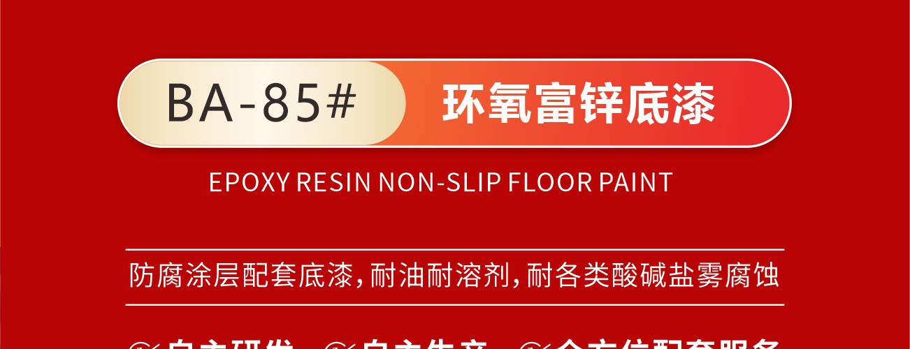 環(huán)氧富鋅底漆,鋅粉含量≥70%,適用于各種建筑物的金屬件、鋼鐵支架、鋼鐵橋梁、金屬儲罐及其它大型鋼結構的防腐防銹涂裝涂刷。 特 性:優(yōu)異的防腐蝕性能;優(yōu)良的耐油性、耐溶劑性、耐水性及耐鹽霧性;良好的基材表面附著力。