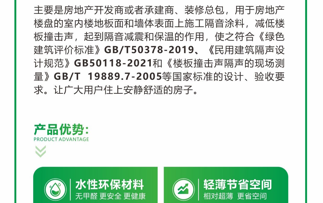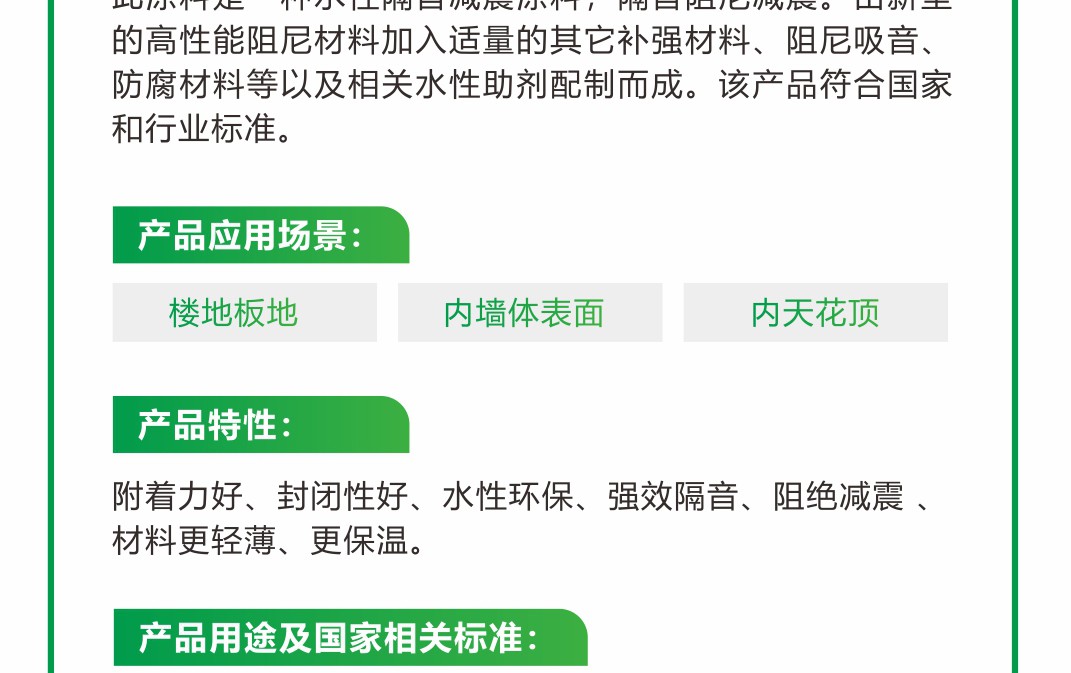 由新型的高性能阻尼材料加入適量的其它補(bǔ)強(qiáng)材料、阻尼吸音、防腐材料等以及相關(guān)水性助劑配制而成。該產(chǎn)品符合國家和行業(yè)標(biāo)準(zhǔn)。附著力好、封閉性好、水性環(huán)保、強(qiáng)效隔音、阻絕減震 、材料更輕薄、更保溫。適用于樓地板底、內(nèi)墻體表面,內(nèi)天花板頂。