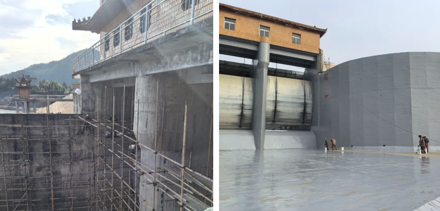 對基面打磨清理后使用彩田新型快速修復抗沖磨材料進行修復找平(施工厚度3mm),后涂刷1mm氟改性高聚物降糙防護涂料進行表面防護處理。