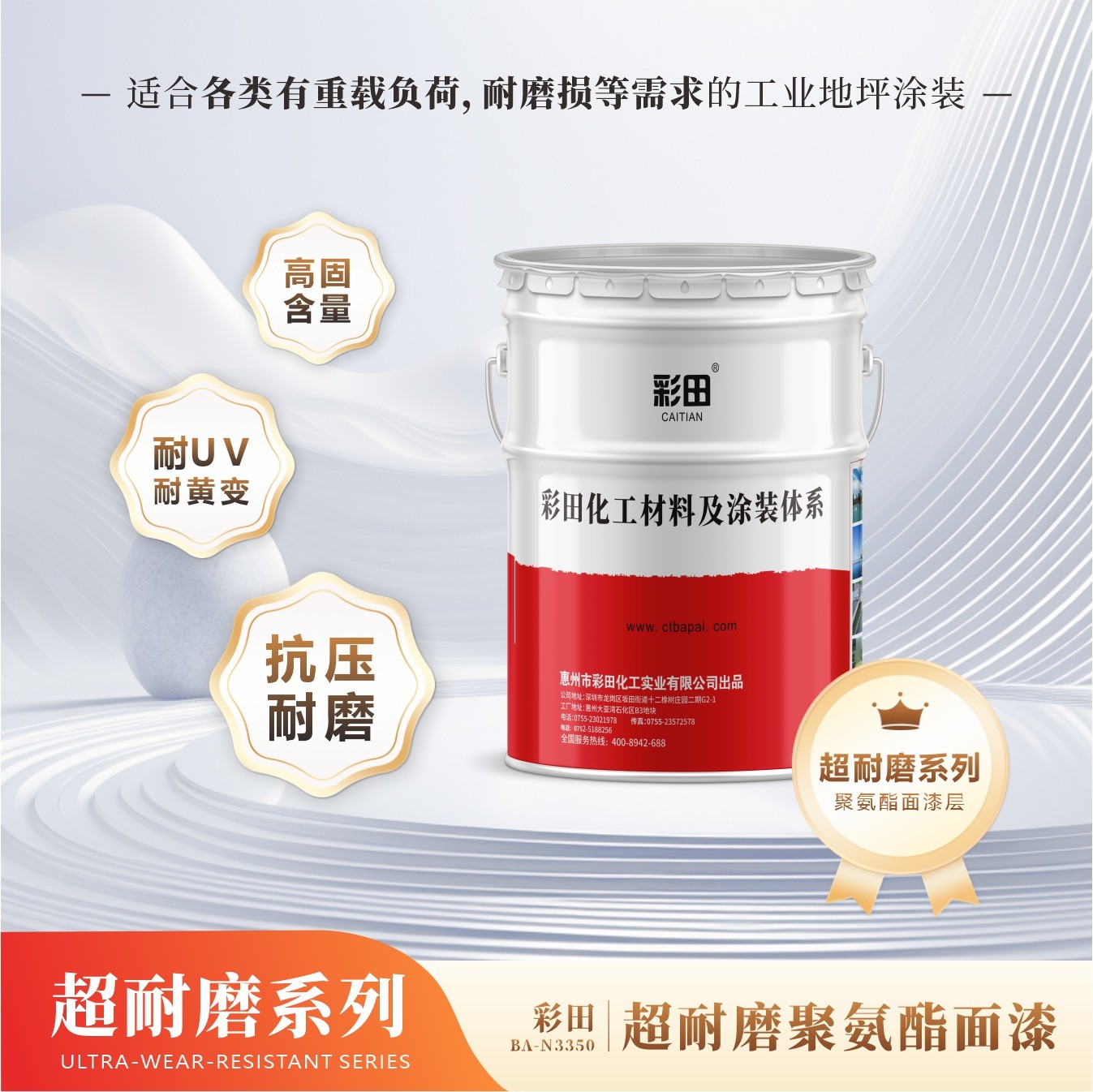 彩田聚氨酯超耐磨面漆的抗劃傷性能、耐候性和耐磨性能,比普通環(huán)氧耐磨性高3倍,也高于一般的水性聚氨酯。表面的細(xì)小顆粒紋理可以降低輪胎的摩擦噪音;對(duì)污垢、油墨、普通酸堿,特別是輪胎摩擦留下的黑印具有極好的抵抗性。