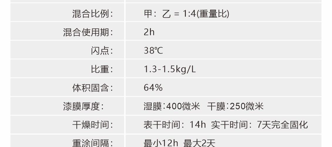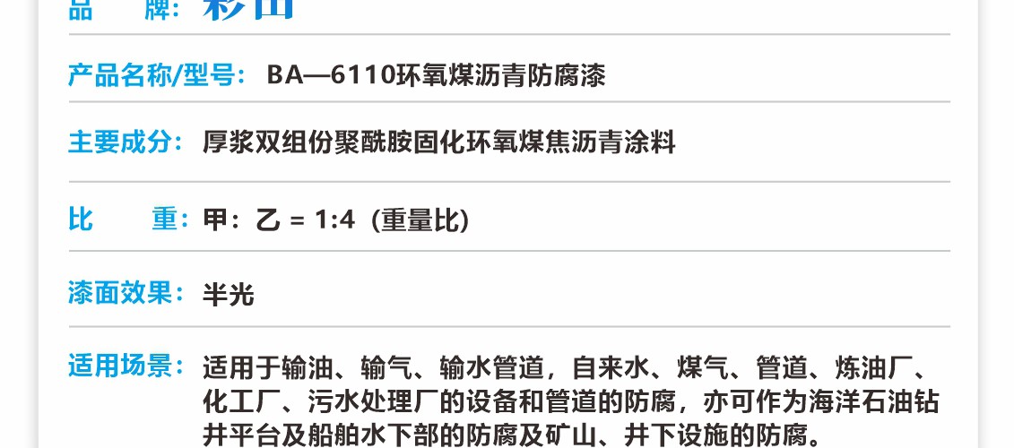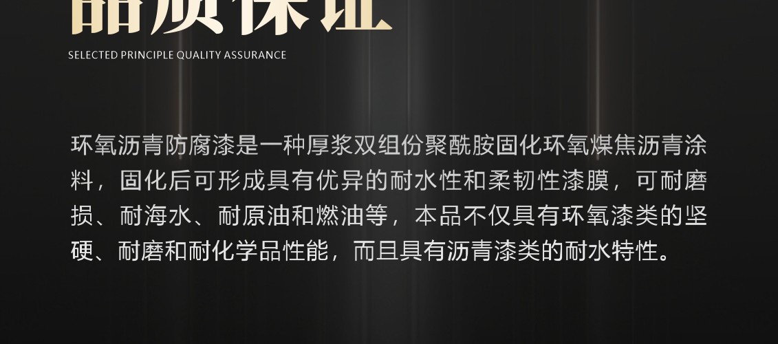 厚漿雙組份聚酰胺固化環氧煤焦瀝青涂料,固化后可形成具有優異的耐水性和柔韌性漆膜,可耐磨損、耐海水、耐原油和燃油等,本品不僅具有環氧漆類的堅硬、耐磨和耐化學品性能,而且具有瀝青漆類的耐水特性。